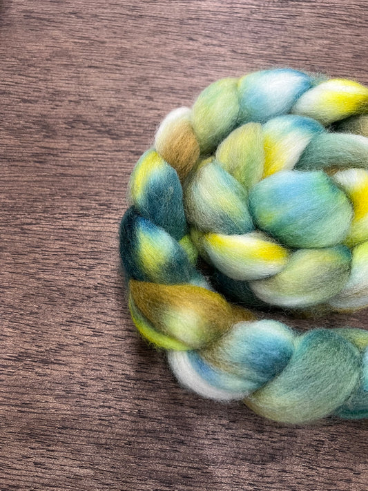 GREEN YELLOW Hand Dyed Spinning Fibre Corriedale Cross Roving Non Superwash