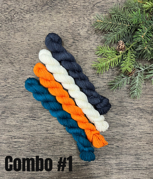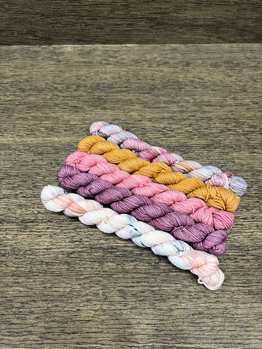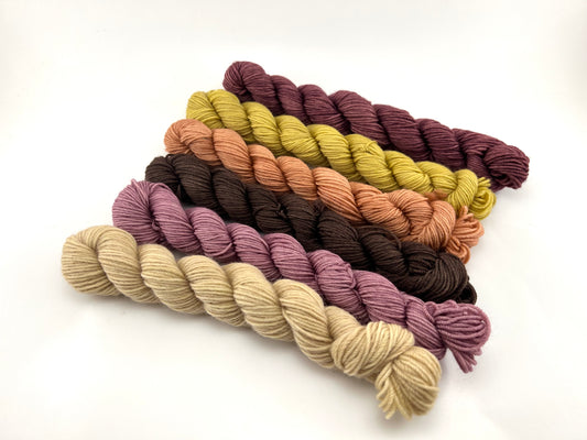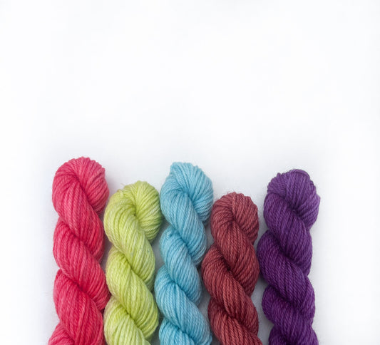 Hand Dyed Mini Skein Yarn Set, 20g Skeins, yards, SW Merino DK Weight Coral Purple Blue Neon Gift for Knitters