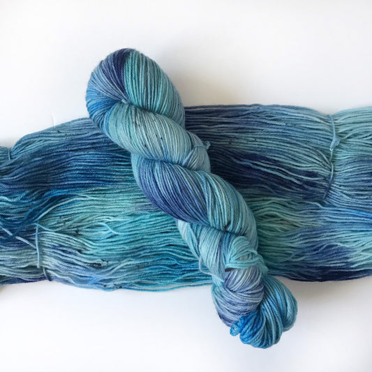 Hand Dyed Yarn “CASCADE” Blue Black Turquoise Speckled SW Merino DK Sock Yarn, Ready to Ship 100g 250 yards
