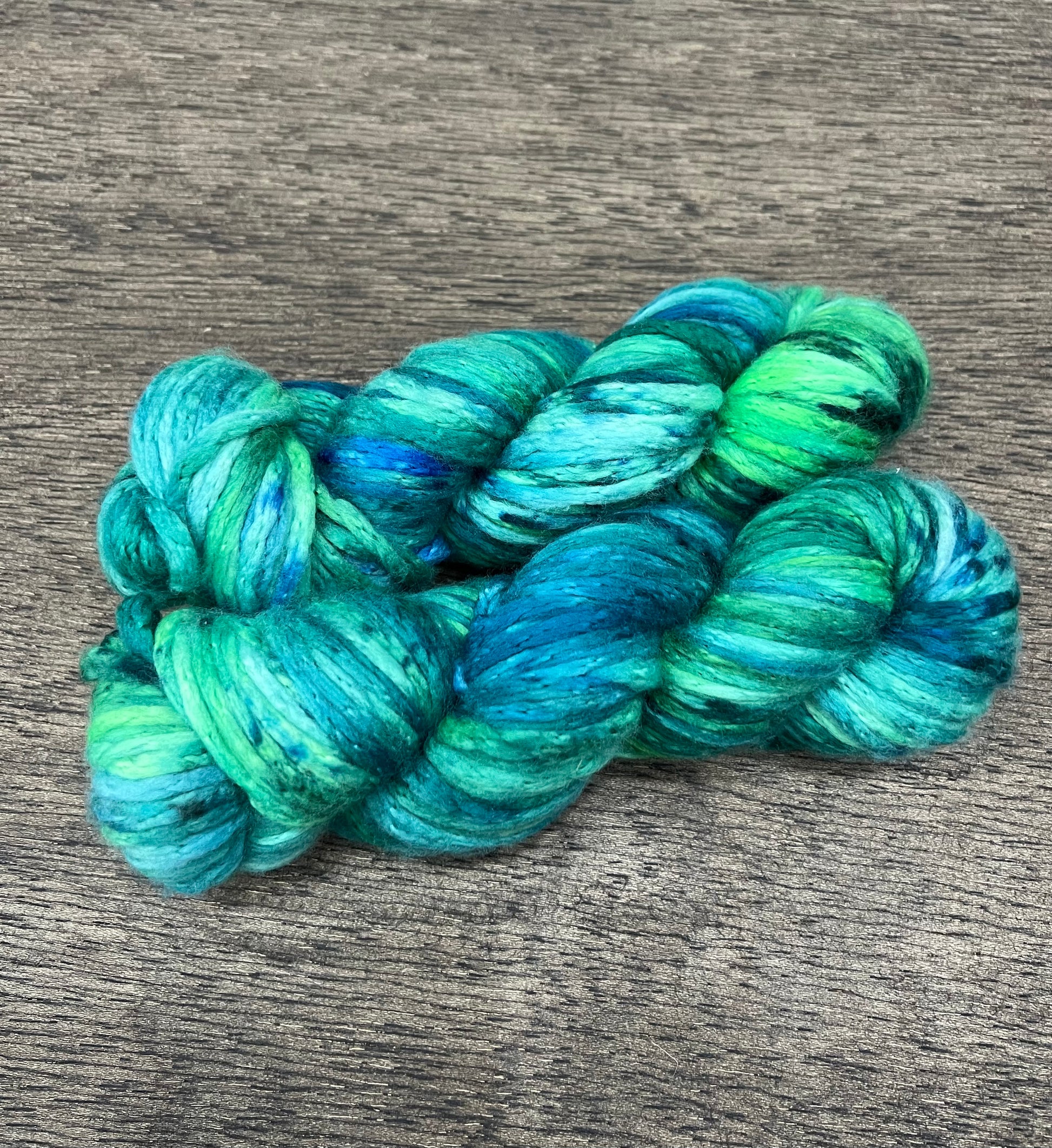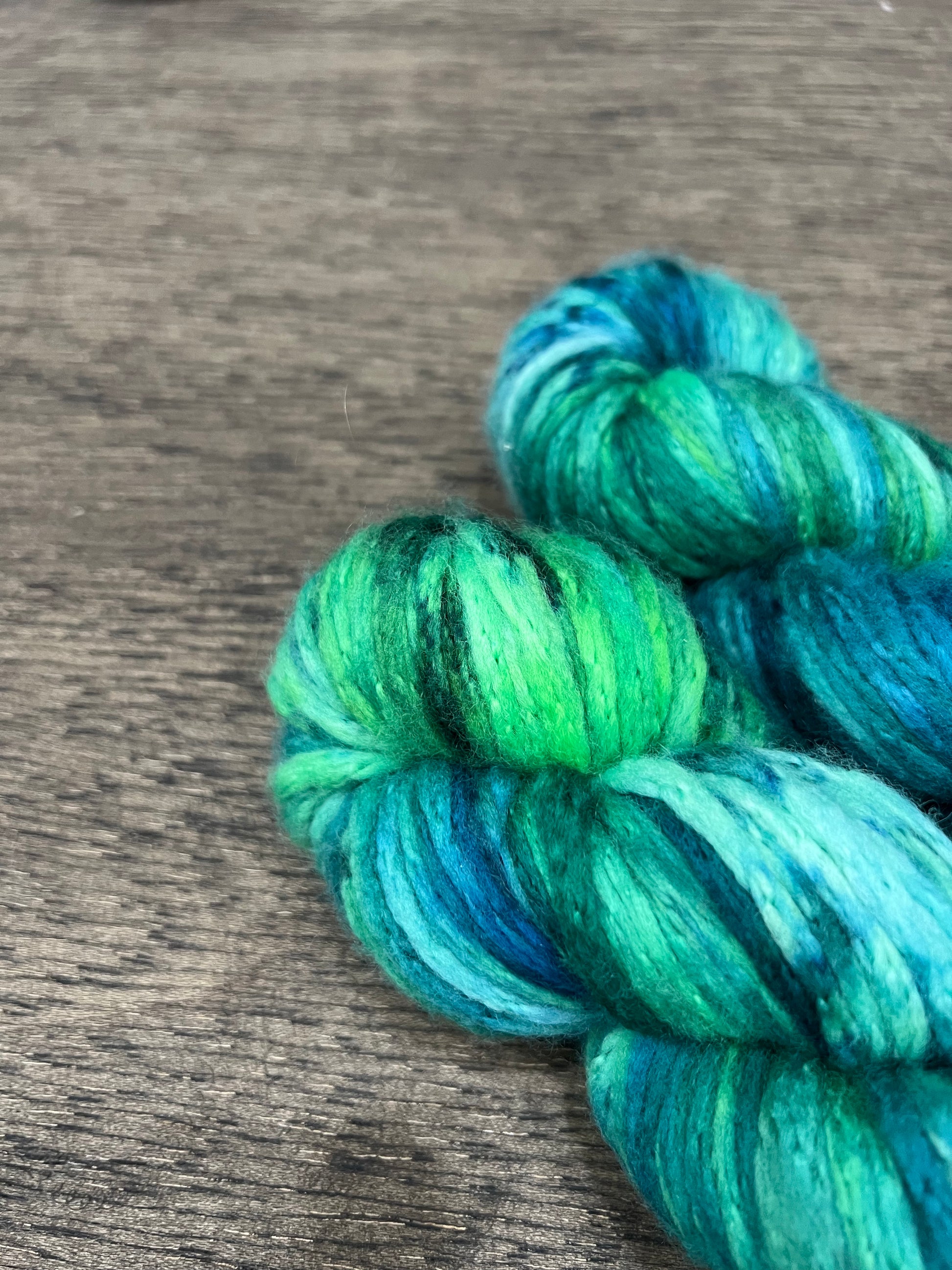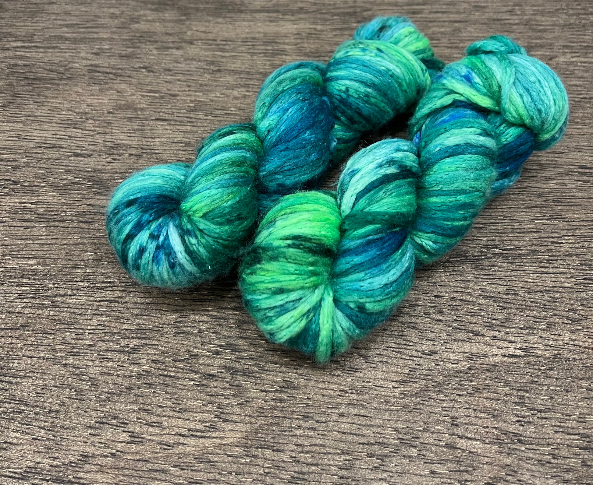 Each skein is hand dyed in small batches in our smoke free workshop, using professional acid dyes and high quality yarn. No two skeins are identical, even if they come from the same dye lot; a feature that lends to their beauty!