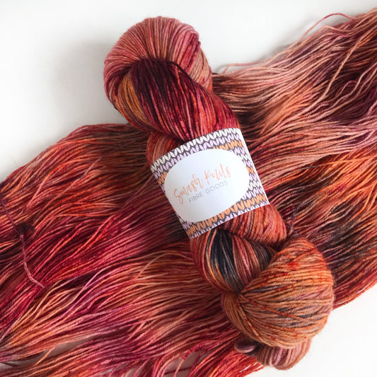 Hand Dyed Yarn “CRUNCHING LEAVES” Burgundy Orange Navy Cream SW Merino Fingering Sock Yarn, Ready to Ship 100g 437 yards