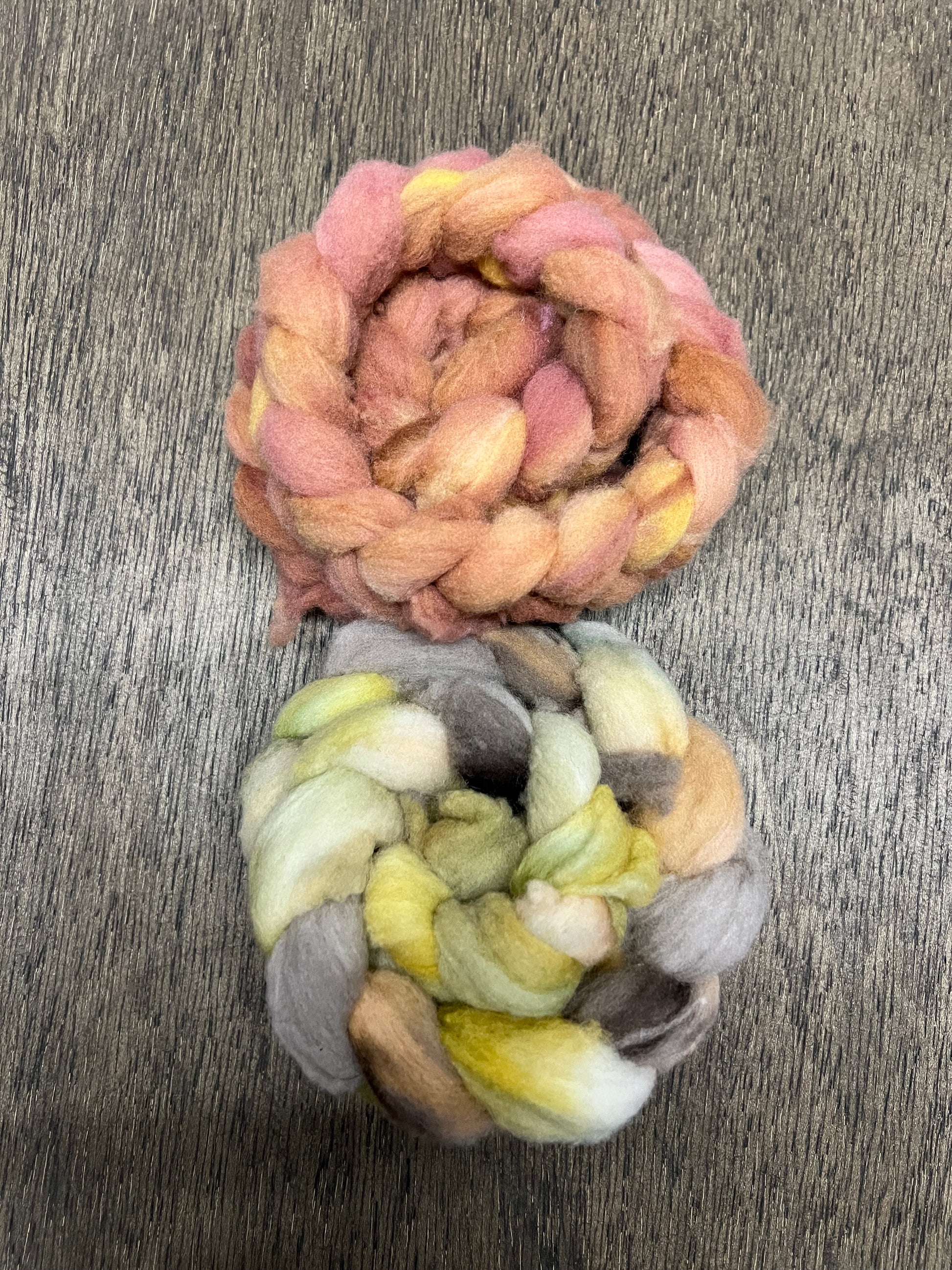 Each braid of roving and top is hand dyed in small batches in our smoke free workshop, using professional acid dyes and high quality yarn and fibre. No two braids are identical, even if they come from the same dye lot; a feature that lends to their beauty!